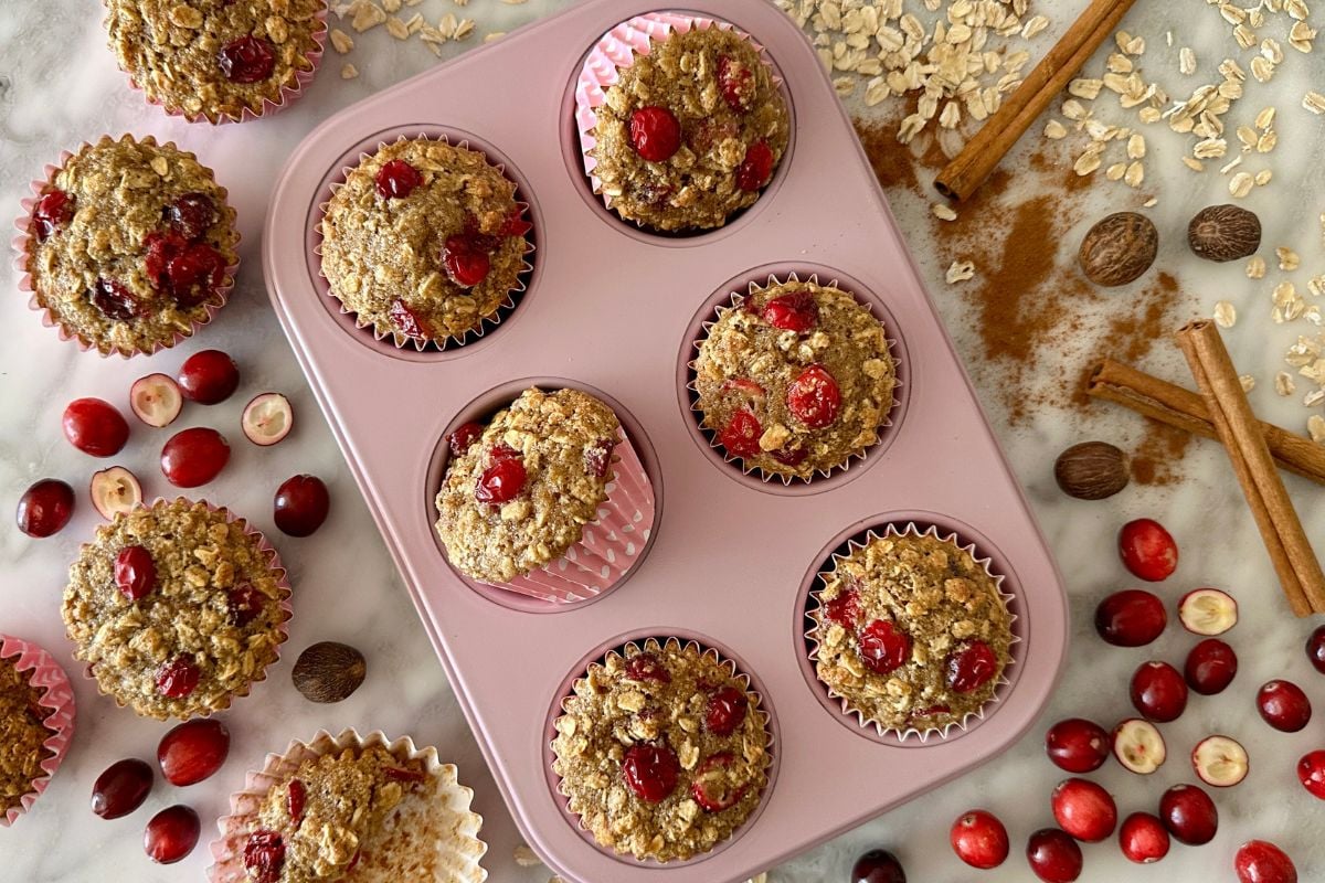 These Cranberry Banana Oat Muffins are made with oat flour, rolled oats, bananas, applesauce, and fresh cranberries for a soft, moist, lightly sweetened breakfast or snack that’s perfect for fall and winter.