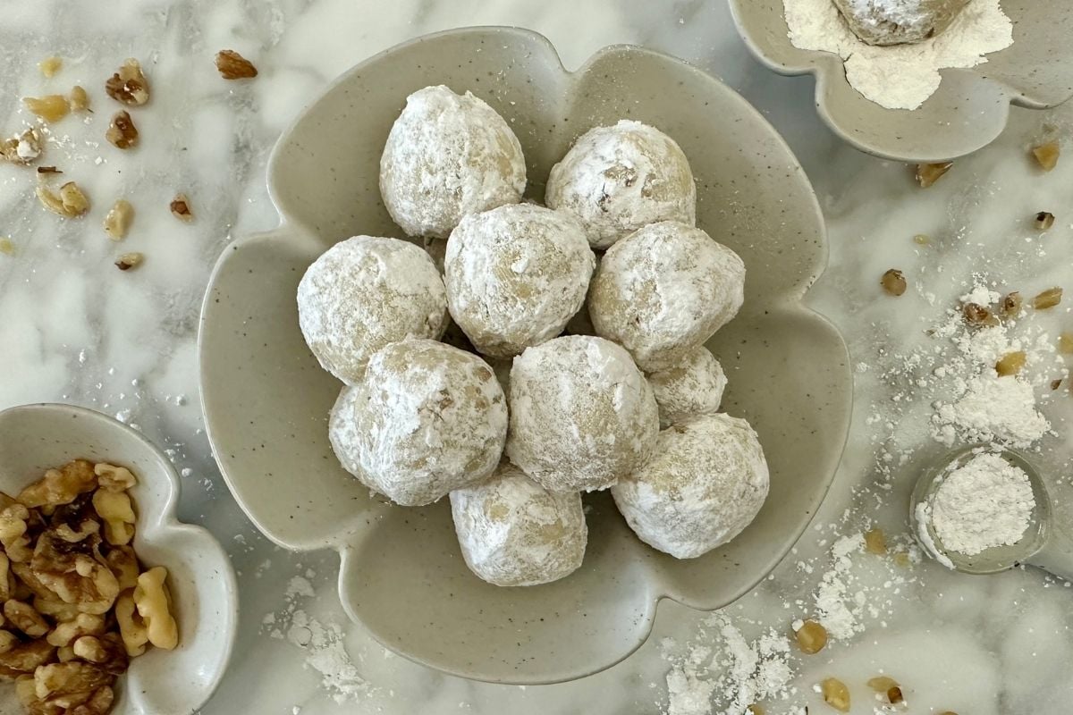 I took my mom’s classic recipe and gave it a lightened-up twist, without losing the nostalgic flavor I grew up with. She always made them with walnuts, and that’s the taste I remember most, but you can also use pecans or almonds, whatever your family loves. These lighter snowball cookies still have that perfect amount of sweetness and the soft, delicate texture that makes them so special.
