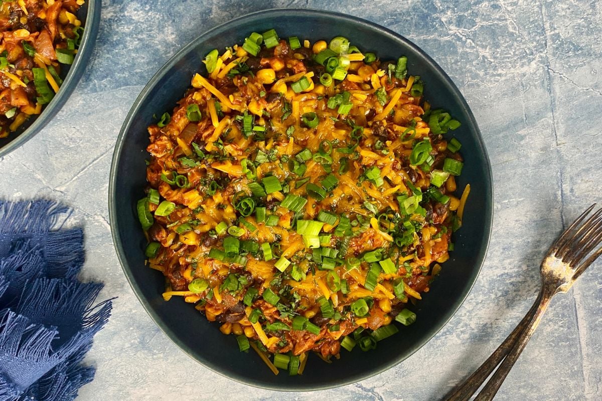 - To serve the enchilada bowl, mix the ingredients and top with some fresh cilantro and the green parts of green onions. Enjoy!